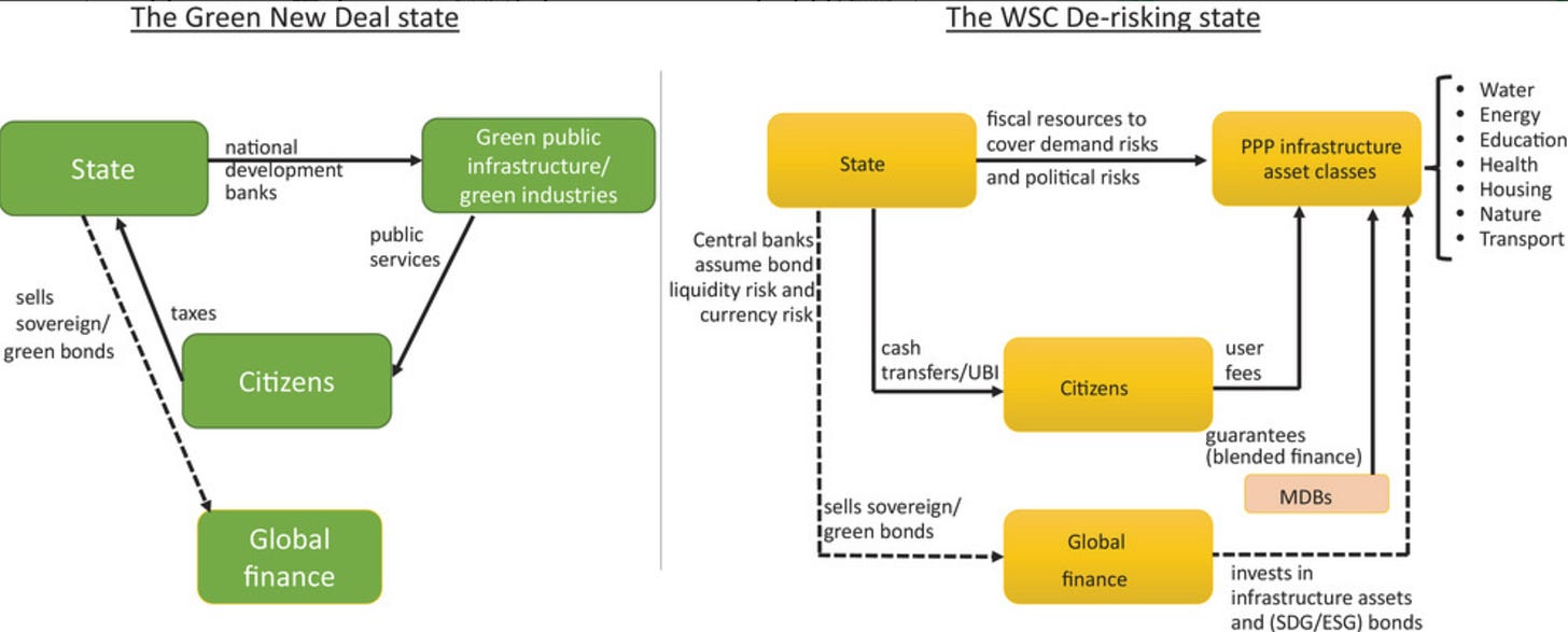 Politically it’s a project of class power which seeks to reorient state resources and institutions toward protecting the power of modern finance capital. It requires power-blocs to consolidate around the de-risking state. The movement from the Washington Consensus to the WSC has represented a rhetorical and ideological shift in capitalist class rule. Rather than relying on the neoclassical myth of the free market, there’s a focus on the need to explicitly fix market failures, including closing funding gaps and de-risking.